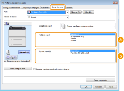 A fonte de papel é automaticamente selecionada de acordo com o tamanho e tipo de papel especificado para impressão e de acordo com as definições configuradas na máquina.