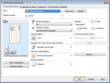 Você pode especificar facilmente o layout da página, a posição de encadernação, etc. intuitivamente na imagem de visualização. Para obter mais informações, clique em [Ajuda] na tela do driver de impressora.