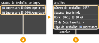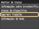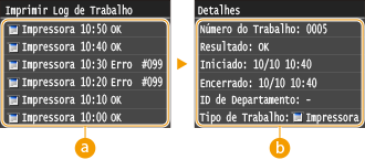 ![]() <Imprimir Log de Trabalho>Exibe uma lista de documentos que foram impressos. <OK> é exibido quando um documento foi impresso com sucesso, e <Erro> é exibido quando um documento falhou ao ser impresso pois foi cancelado ou ocorreu um erro.