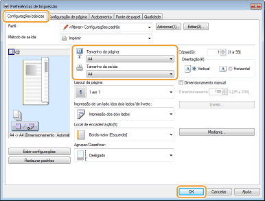 Guia [Configurações básicas] Selecione o tamanho do documento em [Tamanho da página] Selecione o tamanho do papel em [Tamanho da saída] [OK]