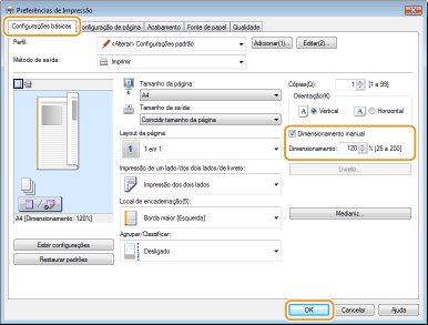 Guia [Configurações básicas] Marque a caixa de seleção [Dimensionamento manual] Insira a razão de impressão em [Dimensionamento] [OK]
