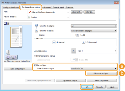 Clique em cada guia para especificar o texto, a cor, ou a posição de impressão da marca d'água. Para mais informações, clique em [Ajuda] na tela do driver de impressora.