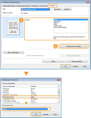 Na tela [Configurações avançadas], você pode especificar várias configurações de impressão diferentes das configurações de economia de toner. Para mais informações, clique em [Ajuda] na tela do driver de impressora.