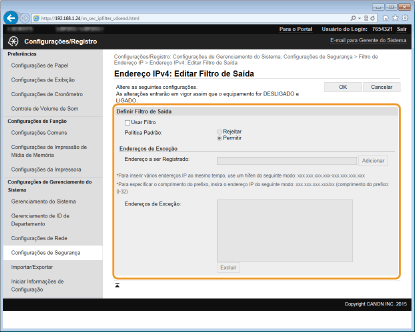 Selecione para bloquear os pacotes de comunicação quando eles forem enviados ou recebidos dos dispositivos cujos endereços IP são digitados no [Endereços de Exceção]. A comunicações com outros dispositivos são permitidas.