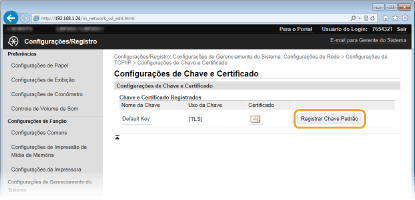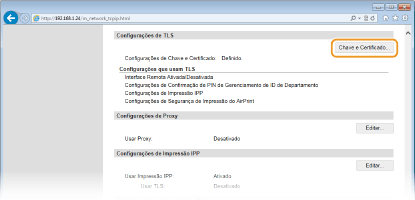 Você pode criptografar a comunicação entre a máquina e um navegador da internet no computador ao usar o Transport Layer Security (TLS). O TLS é um mecanismo para codificar os dados enviados ou recebidos pela rede. O TLS precisa estar ativado quando a Interface Remota é usada para a especificação de configurações para IPSec (Método de Chave Pré-Compartilhada), autenticação IEEE 802.1X (TTLS/PEAP) ou SNMPv3. Para usar o TLS para a Interface Remota, você precisa definir um par de chaves e ativar a função TLS. Gere ou instale o par de chaves para o TLS antes de ativar o TLS (