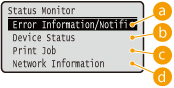 , a screen is displayed that enables you to check the status of document that is being printed, as well as the status of the machine (amount remaining in the toner cartridge, etc.) or the network setting information such as the IP address of the machine.
