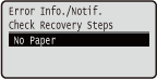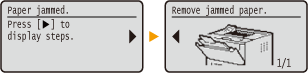 In some cases when an error occurs, instructions on how to respond to the error are displayed. Follow the on-screen instructions to solve the problem. The screen displayed when a paper jam occurs is shown below as an example.