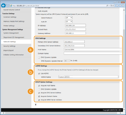 Select the check box to dynamically update the DNS records whenever the machine's IP address is changed. When specifying the interval between updates, enter the time in hours in the [DNS Dynamic Update Interval] text box. [mDNS Settings][Use mDNS]