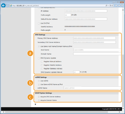 Select the check box to use the same mDNS name as in IPv4. To set a different name, clear the check box and enter the mDNS name in the [mDNS Name] text box. [DHCP Option Settings][Acquire DNS Server Address]