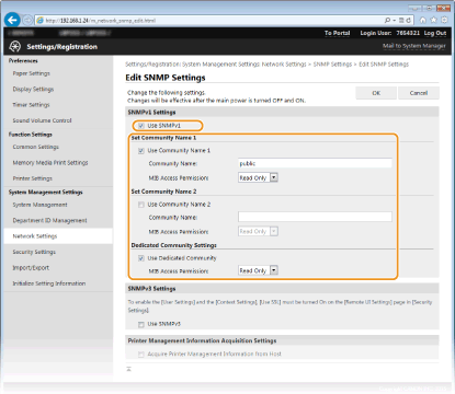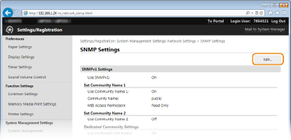 Simple Network Management Protocol (SNMP) is a protocol for monitoring and controlling communication devices in a network by using Management Information Base (MIB). The machine supports SNMPv1 and security-enhanced SNMPv3. You can check the status of the machine from a computer when you print documents or use the Remote UI. You can enable either SNMPv1 or SNMPv3, or both at the same time. Specify the settings for each version to suit your network environment and the purpose of use.