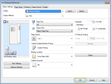 You can easily specify the page layout, binding position, etc. intuitively on the preview image. For more information, click [Help] on the printer driver screen.