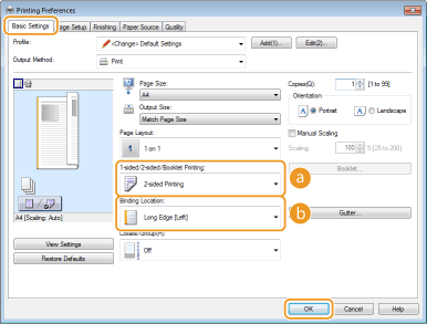 [Basic Settings] tab Select [1-sided Printing] or [2-sided Printing] in [1-sided/2-sided/Booklet Printing] Select the position to bind in [Binding Location] [OK]