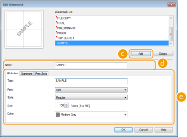 Click each tab to specify the text, color, or print position of the watermark. For more information, click [Help] on the printer driver screen.