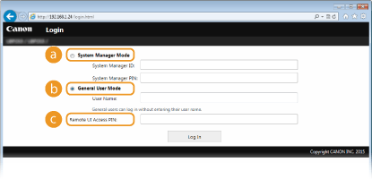 You can perform all the Remote UI operations and settings. Enter the appropriate ID in [System Manager ID] and PIN in [System Manager PIN] (