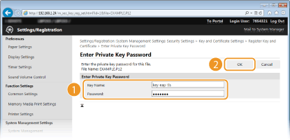 [Password] Enter up to 24 alphanumeric characters for the password of the private key set for the file to be registered.