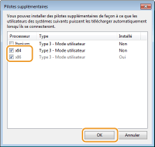 Il peut être impossible d'installer les pilotes par le réseau selon le système d'exploitation et l'architecture (32 bits ou 64 bits) du serveur d'impression et des ordinateurs clients.