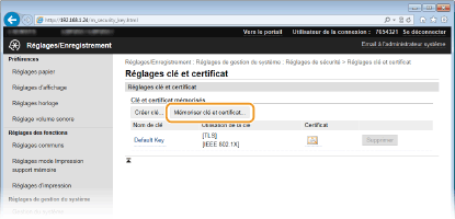 Cliquez sur [Réglages clé et certificat] pour installer une paire de clés, ou sur [Réglages certificat CA] pour installer un certificat CA.