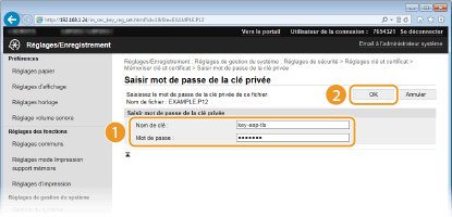 [Mot de passe] Saisissez le mot de passe de la clé privée définie pour le fichier à enregistrer dans la limite des 24 caractères alphanumériques autorisés