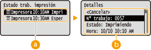 .![]() <Estado de trab. de impresión>Muestra la lista de documentos que se están procesando o a la espera de procesarse.