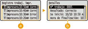 .![]() <Registro de trabajos impresión>Muestra una lista de los documentos que se han impreso.Correcto> aparece cuando un documento se imprime correctamente, y <Error> aparece cuando un documento no se imprime correctamente porque se canceló o se produjo algún error.