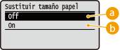 Sustituye el tamaño de papel. Sin embargo, si no hay papel de sustitución en ninguno de los orígenes del papel, no podrá llevarse a cabo la sustitución.