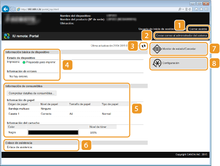 Muestra el estado actual del equipo y la información de error. Si se ha producido un error, aparecerá el vínculo a la página Información de error.