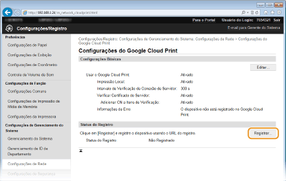 Você precisa ativar o Google Cloud Print. Clique em [Editar], selecione a caixa de seleção [Usar o Google Cloud Print] e clique em [OK].