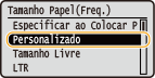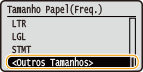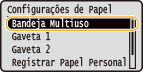 Depois que a configuração de papel padrão é registrada, a tela de configuração de papel não é exibida quando o papel é carregado, e a mesma configuração é usada. Se você carregar um tamanho ou tipo de papel diferente, a máquina pode não imprimir adequadamente. Para evitar este problema, selecione <Especificar ao Colocar Papel> na etapa 3 e depois carregue o papel.