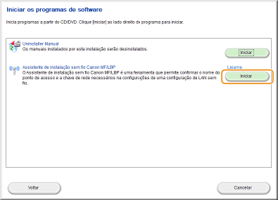 Clique em [Iniciar] para o [Assistente de instalação sem fio Canon MF/LBP].