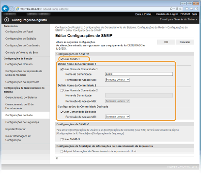 O Simple Network Management Protocol (SNMP) é um protocolo para monitorar e controlar os dispositivos de comunicação em uma rede usando a base de informações de gerenciamento (MIB). A máquina suporta o SNMPv1 o SNMPv3 com segurança aprimorada. Você pode verificar o status da máquina de um computador quando você imprime documentos ou usa a Interface Remota. Você pode ativar o SNMPv1 ou o SNMPv3, ou ambos ao mesmo tempo. Especifique as definições para que cada versão seja compatível com seu ambiente de rede e a finalidade de uso.