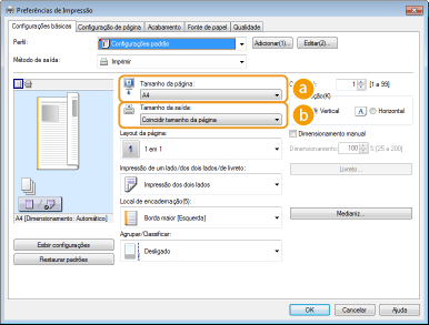Você pode especificar facilmente o layout da página, a posição de encadernação, etc. intuitivamente na imagem de visualização. Para obter mais informações, clique em [Ajuda] na tela do driver de impressora.