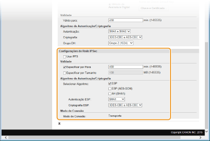 Para ativar a autenticação ESP, selecione [SHA1] para o algoritmo hash. Selecione [Não Usar] se você deseja desativar a autenticação ESP.
