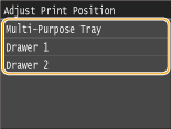 You can use <Printer Settings> in the setting menu of the operation panel to adjust the print position for all print jobs regardless of the paper source. You can adjust the print position in the range of -50.0 to +50.0 mm in 0.5 mm increments in vertical/horizontal direction.