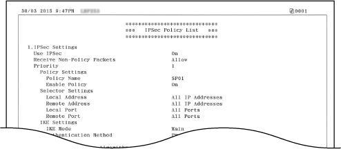 You can check the list of policy names and the IPSec settings registered in the machine by printing an IPSec Policy List.