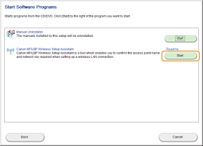 Click [Start] for [Canon MF/LBP Wireless Setup Assistant].