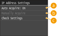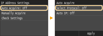 ![]() If <On> is displayed, tap <Auto Acquire>, and set both <Select Protocol> and <Auto IP> to <Off>.