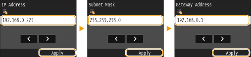 <Subnet Mask> <Gateway Address>.Enter each setting using the numeric keys, and tap <Apply>.