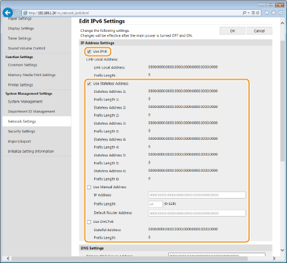 The IPv6 addresses of the machine can be configured via the Remote UI. Before setting IPv6 addresses, check the IPv4 address settings (Viewing IPv4 Settings). You need to set the correct IPv4 settings to use IPv6 addresses. The machine can use up to nine of the following IPv6 addresses:
