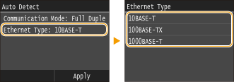 select the Ethernet type.![]() ![]() When <Communication Mode> is set to <Half Duplex>, you cannot select <1000BASE-T>.