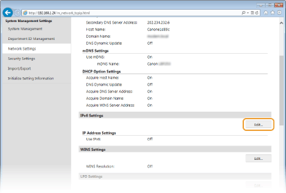Select the check box to use the same mDNS name as in IPv4. To set a different name, clear the check box and enter the mDNS name in the [mDNS Name] text box. [DHCP Option Settings][Acquire DNS Server Address]