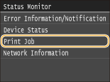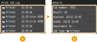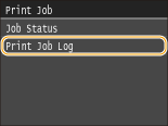 ![]() <Print Job Log>Displays a list of the documents that were printed. <OK> is displayed when a document was printed successfully, and <Error> is displayed when a document failed to be printed because it was canceled or there was some error.