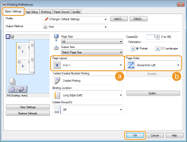 You can print multiple pages onto a single sheet. For example, you can print four or nine pages onto a single sheet by using [4 on 1] or [9 on 1]. Use this function if you want to save paper or to view your document in thumbnails.