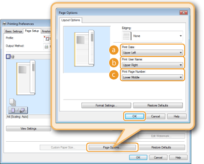 [Page Setup] tab Click [Page Options] Select the print position of the print date, user name or page number [OK]  [OK]