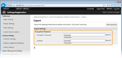 Enter an encryption password up of up to 32 alphanumeric characters. Enter the same password in [Confirm]. To export the data, you must set an encryption password.