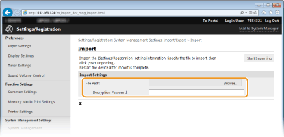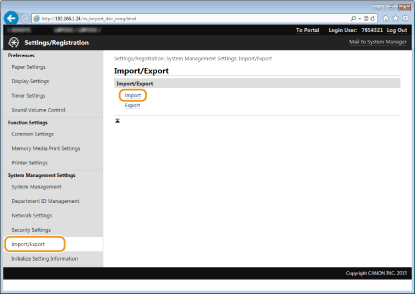 Load (import) data that was exported from the machine. You can also import settings from another machine if it is the same model as your machine.