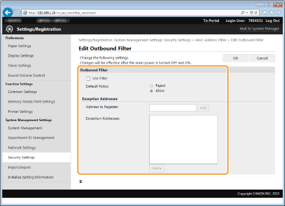 If MAC addresses are incorrectly entered, you may become unable to access the machine from the Remote UI, in which case you need to set <MAC Address Filter> to <Off>. MAC Address Filter