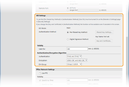 Specify the [Valid for] and [Authentication]/[Encryption]/[DH Group] settings.