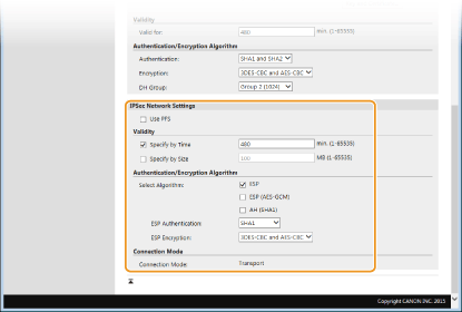 To enable the ESP authentication, select [SHA1] for the hash algorithm. Select [Do Not Use] if you want to disable the ESP authentication.