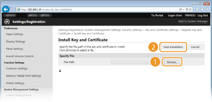 Key pairs and digital certificates can be obtained from a certification authority (CA) for use with the machine. You can store and then register these files by using the Remote UI. Make sure that the key pair and the certificate satisfy the requirements of the machine (