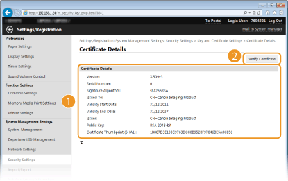 Click [Key and Certificate Settings] to verify a key pair, or [CA Certificate Settings] to verify a CA certificate.